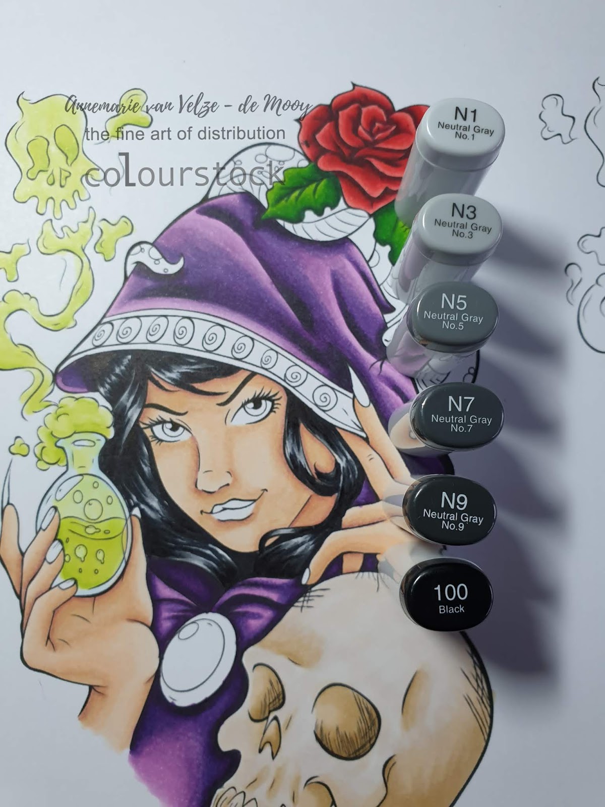 Ik pak vaak wat Copics waarvan ik denk dat het samen leuk is en gaande weg pak ik er soms nog wat bij of leg ik weer wat weg. Bij deze bloem ben ik drie keer overnieuw begonnen voordat ik tevreden was.